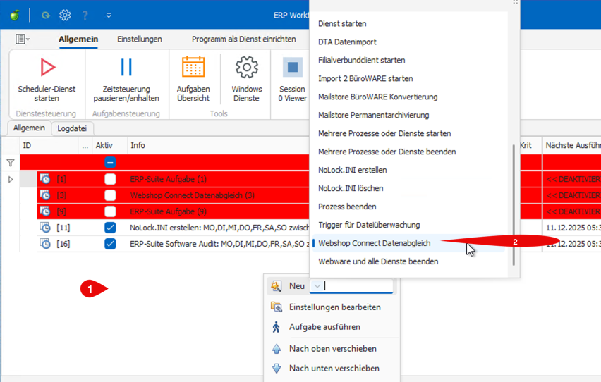 Erstellen Sie im ERP-Starter über einen Rechtsklick (1) in der Übersichtstabelle der Aufgaben eine neue Aufgabe: "Webshop Connect Datenabgleich" (2)