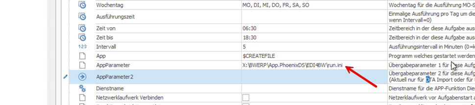 Bearbeiten Sie anschließend die gerade erstellte Aufgabe mit einem Rechtsklick auf den Eintrag und passen Sie den Pfad, wo die Datei run.ini abgelegt werden soll, auf den Programmpfad von EDI4BueroWARE an.