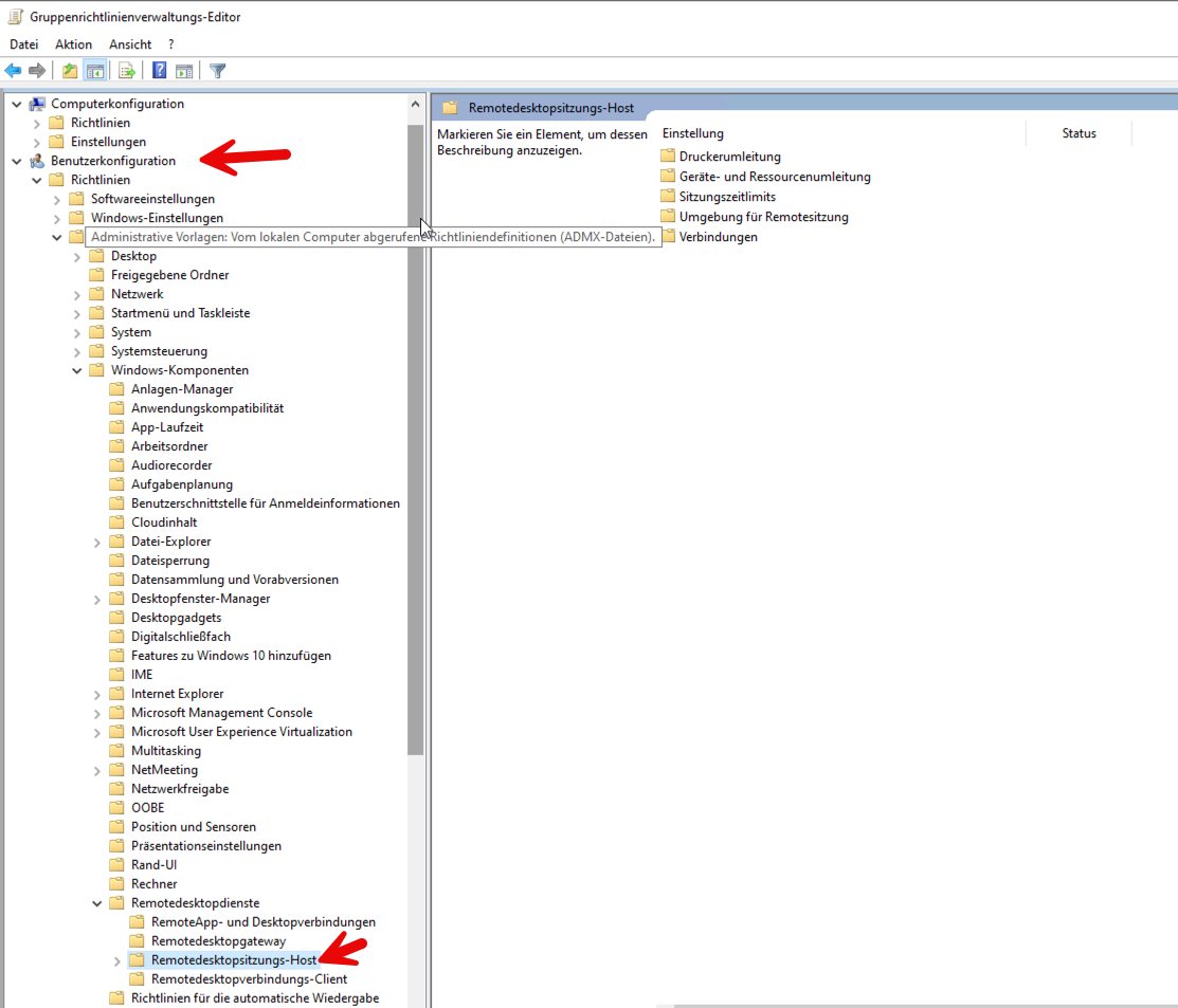Wechseln Sie in den Ast "Remotedesktopsitzungs-Host" in den Unterast "Umgebung für Remotesitzung"