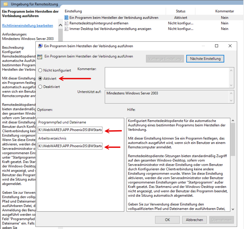 Computerkonfiguration → Administrative Vorlagen → Windows-Komponenten → Remotedesktopdienste → Remotedesktopsitzungs-Host → Umgebung für Remotesitzung → Remotestart nicht aufgeführter Programme zulassen