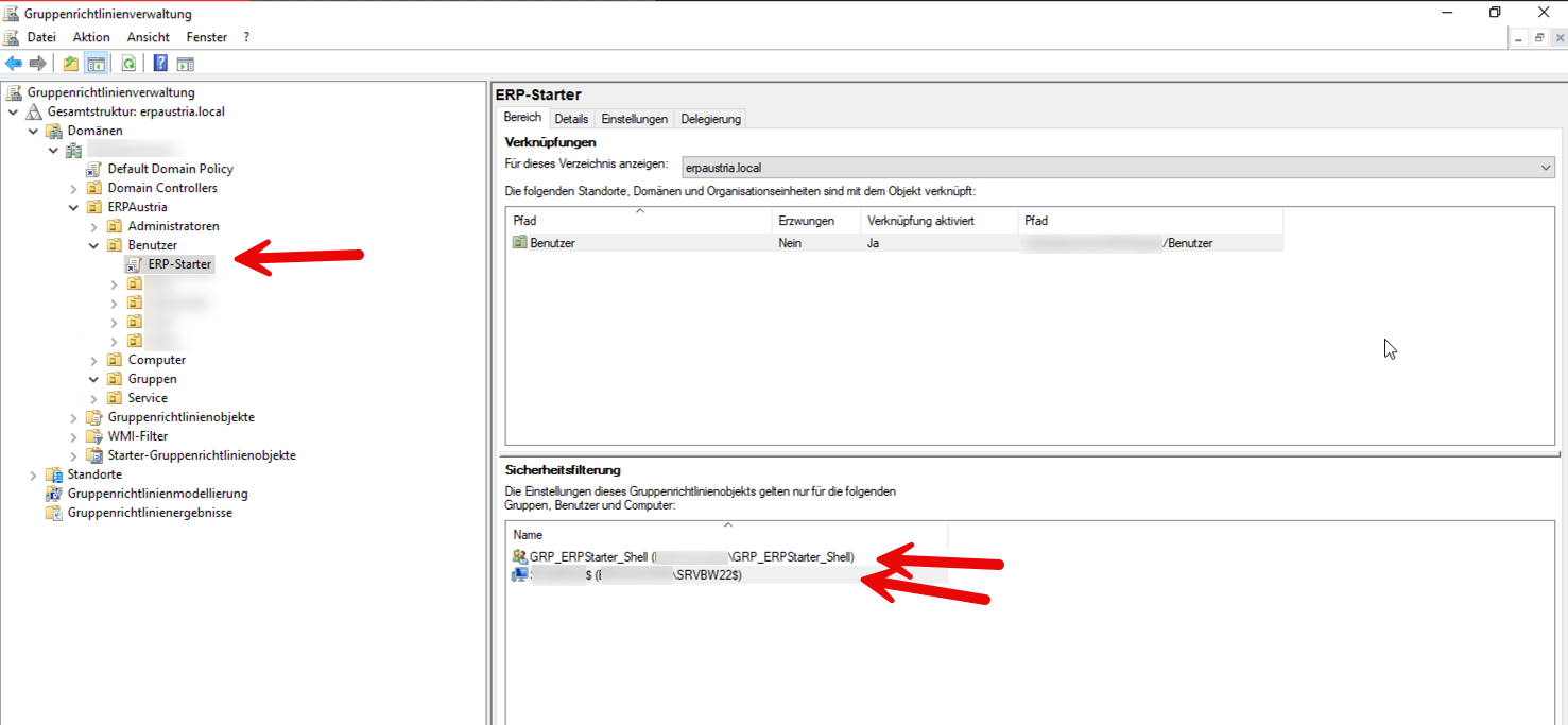 Legen Sie im Active Directory eine Gruppe z. B. GRP_ERP_Starter an und fügen Sie die benötigten User in diese Gruppe ein. Dann übernehmen Sie diese Gruppe in der Richtlinie im Block "Sicherheitsfilterung" und fügen hier noch den RDP-Server hinzu, für den dieses Objekt gelten soll, damit dieses nur auf diesem Server gültig ist.