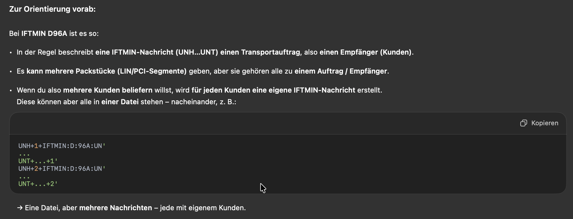 Es soll das vorhandene, nicht mehr aktuelle Übertragungsformat (XML) auf das Format IFTMIN shipment umgestellt werden da sich die Logistikfirma geändert hat.